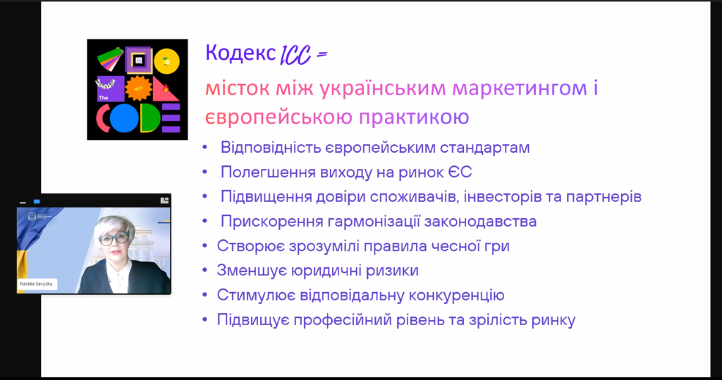 Керівниця Центру маркетингових досліджень та ініціатив Державного біотехнологічного університету, членкиня Ради ГО «Українська Асоціація Маркетингу», Голова Харківського регіонального представництва ІГКР УАМ, доктор економічних наук, професор, презентувала переклад українською мовою Кодекс та надала контекст застосування в Україні.