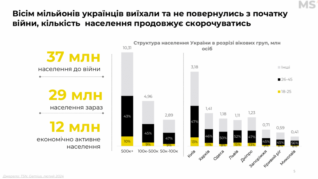 • До війни населення – 37 млн; після міграції – близько 29 млн.