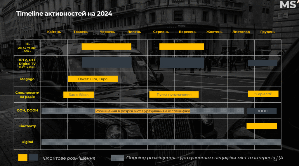 • Стратегія поєднує: ТБ + діджитал + OOH + радіо + спецпроєкти.