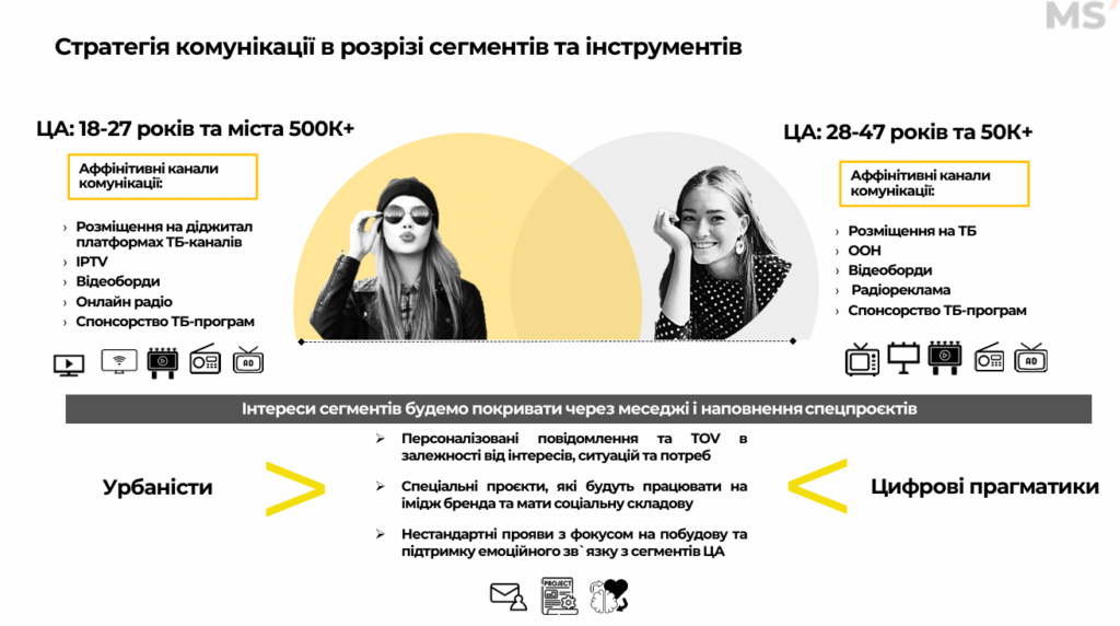 • Урбаністи (18–27, великі міста) → YouTube, digital-ТБ, OOH, спецпроєкти.