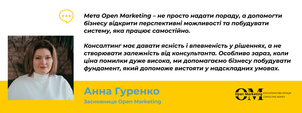 Діяльність консалтингової агенції Open Marketing стала логічною відповіддю на безпрецедентні виклики, з якими зіткнувся український бізнес з початком повномасштабного вторгнення. У період, коли звичні ринкові механізми зупинилися, а підприємці опинилися в ситуації критичного вибору між релокацією, трансформацією чи закриттям, агенція взяла на себе роль стратегічного партнера та точки опори для мікро-, малого та середнього бізнесу.