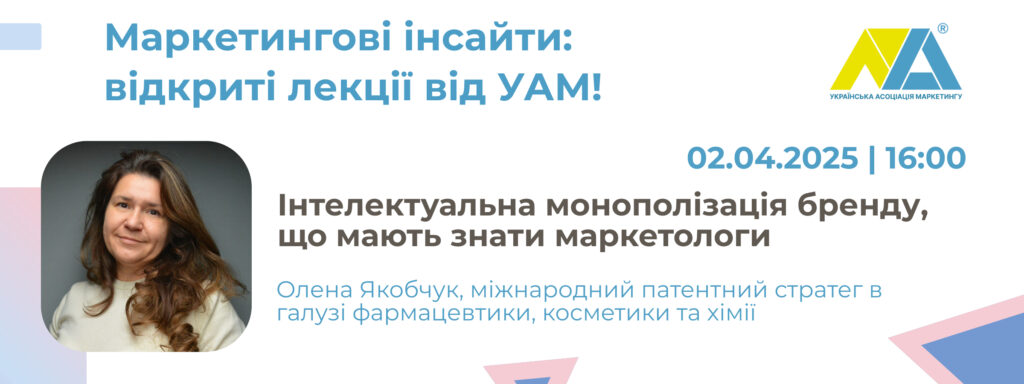 УАМ організовує п’ятий захід у циклі весняних лекцій та воркшопів УАМ – воркшоп “Інтелектуальна монополізація бренду, що мають знати маркетологи“. Подія відбудеться онлайн 02 квітня 2025 року. Запрошуємо всіх, хто хоче отримати як теоретичні знання, так і практичні навички використання інтелектуальної власності у маркетингових стратегіях.