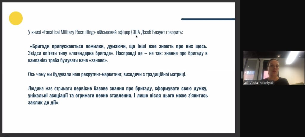Викладачі маркетингових дисциплін з різних міст країни приєднались до вебінару, аби розібрати разом з Владиславою Миколюк, як футбольний клуб, рок-альбом, забіги з перешкодами, авто з доповненою реальністю, тенісистка та режисер трилерів здатні допомогти залучати до українського війська тисячі захисників в нетривіальних маркетингових комунікаціях найвідоміших бригад країни – «Хартія», «Азов» та «3 ОШБр».