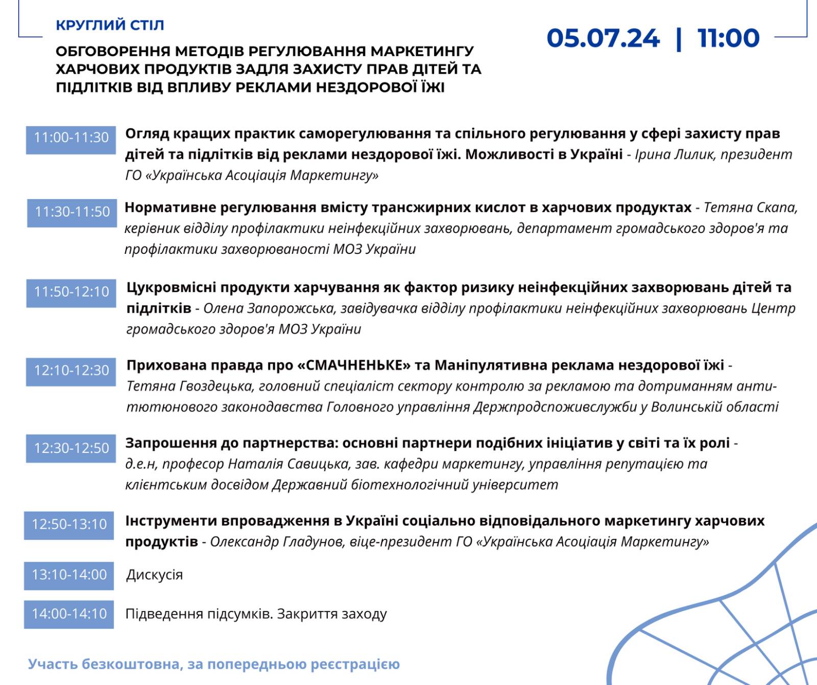 5 липня за Круглим столом обговорювали методи регулювання маркетингу харчових продуктів задля захисту прав дітей та підлітків від впливу реклами нездорової їжі. Світова практика свідчить, що маркетингове регулювання має спиратися на чіткі та прозорі критерії моделі поживних речовин, яка визначає які інгредієнти в продукті переводять його до категорії «нездорової їжі» або навіть «шкідливої їжі». Такі моделі розробляється та приймаються на основі науково-політичної дискусії спільно державним органом влади в сфері охорони здоров’я, науковою спільнотою та громадськістю.